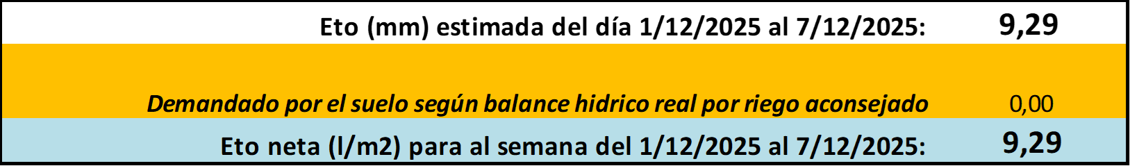 En base a los datos históricos (media de los años 2000-2017), corregidos según la variación medida en la anterior semana, obtenidos en la estación Agroclimática del Instituto Valencianos de Investigaciones Agrarias (IVIA), sita en la partida del Pozuelo (TM de Pedralba), se indica a continuación la dosis de riego aconsejada para la semana en curso.