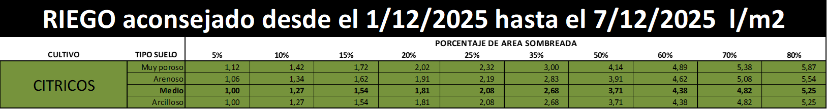 En el cuadro debe elegir, según el tamaño de sus árboles, el tipo de suelo y la variedad, el dato de la DOSIS aconsejada correspondiente. Este valor indica la Necesidad Neta de Riego. Para saber las horas de riego que usted debe emplear, siga las instrucciones de la fórmula que se indica debajo