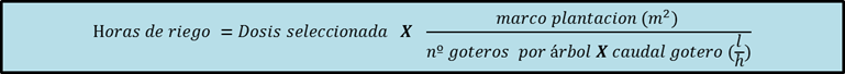 En el cuadro debe elegir, según el tamaño de sus árboles, el tipo de suelo y la variedad, el dato de la DOSIS aconsejada correspondiente. Este valor indica la Necesidad Neta de Riego. Para saber las horas de riego que usted debe emplear, siga las instrucciones de la fórmula que se indica debajo